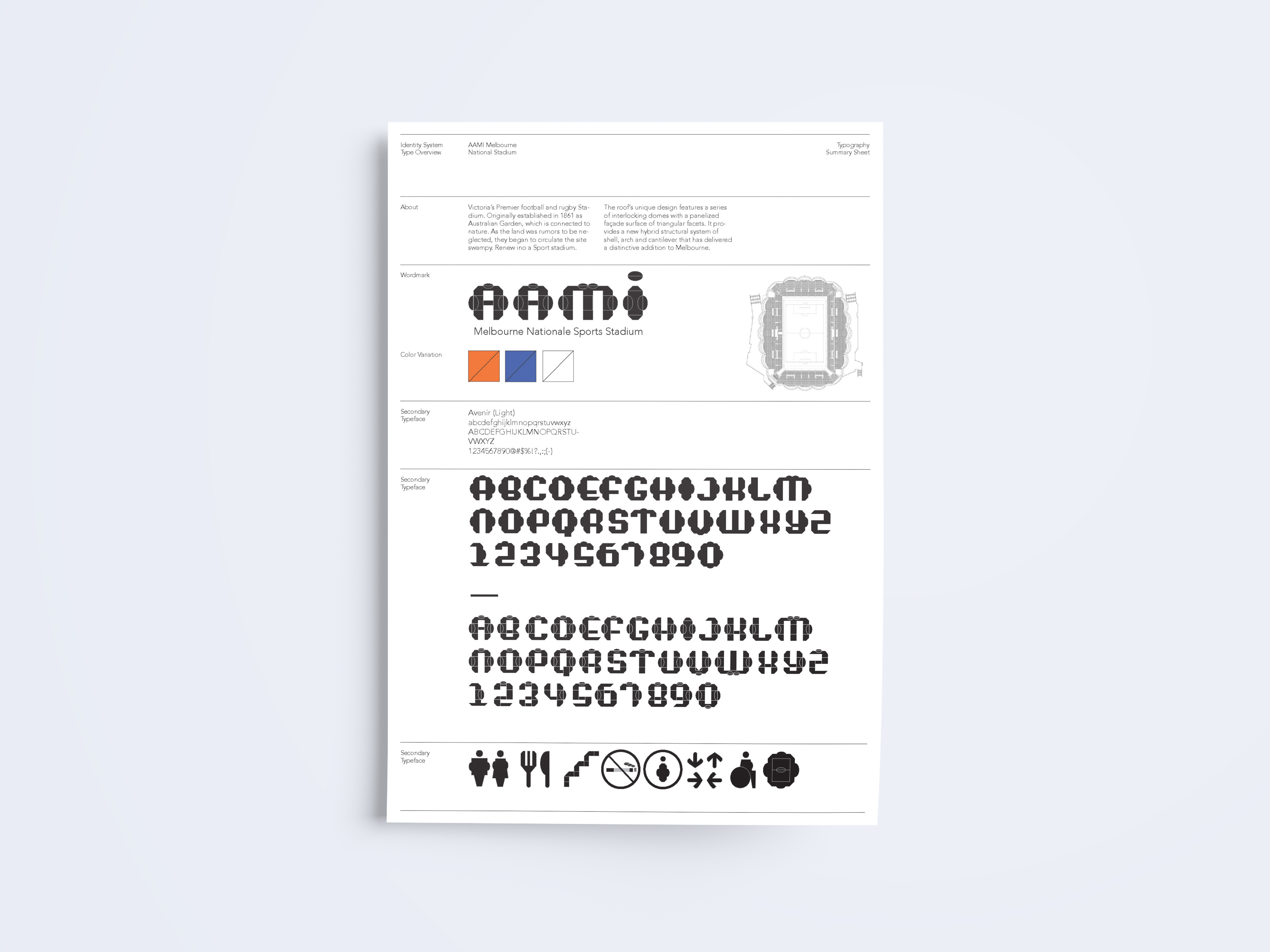 An exploration through typography to rebrand the AAMI National Park in Australia. Taking distinctive parts of the building and getting inspiration for form letters football stadium. My inspiration was looking at the building from a plan view, the shape and how their exits in all parts of the building which is convenient for people who come and watch. The alphabet can be seen with the combination of circular and triangular shapes, to add elements from the building itself.