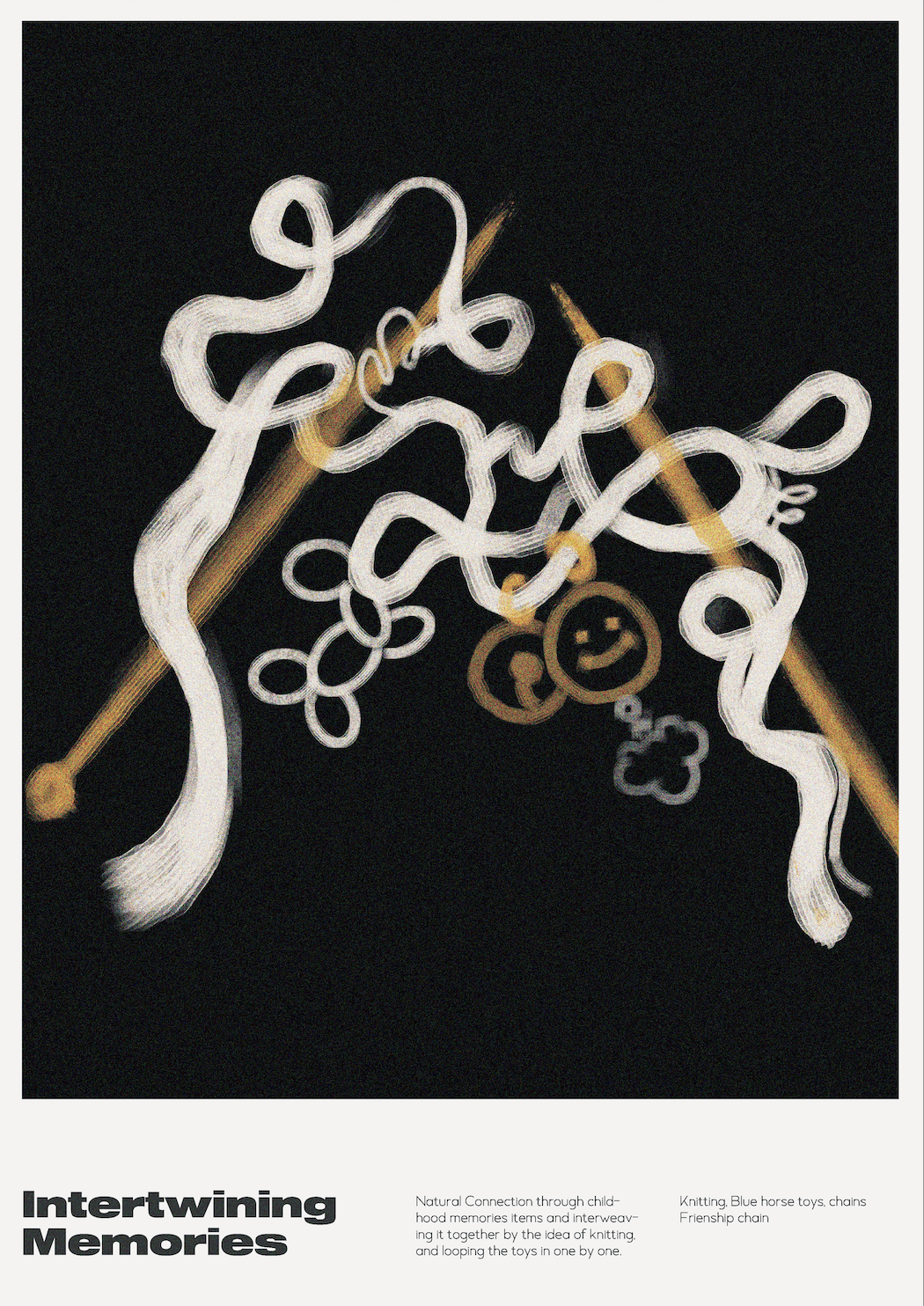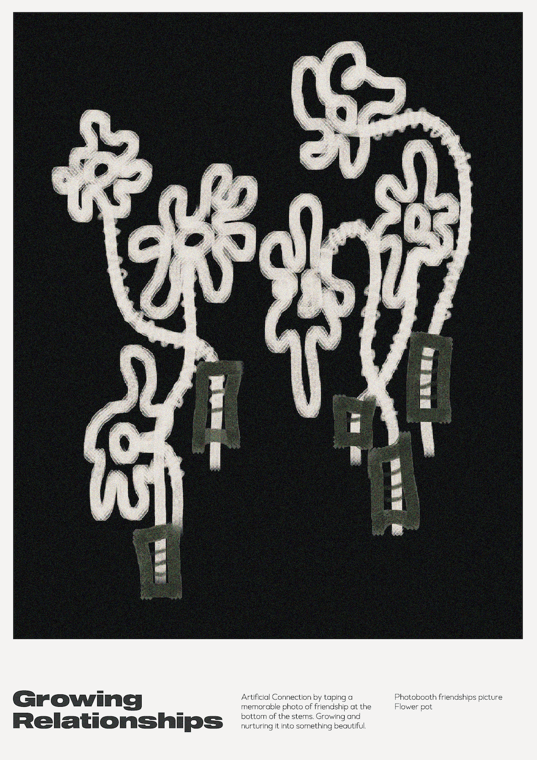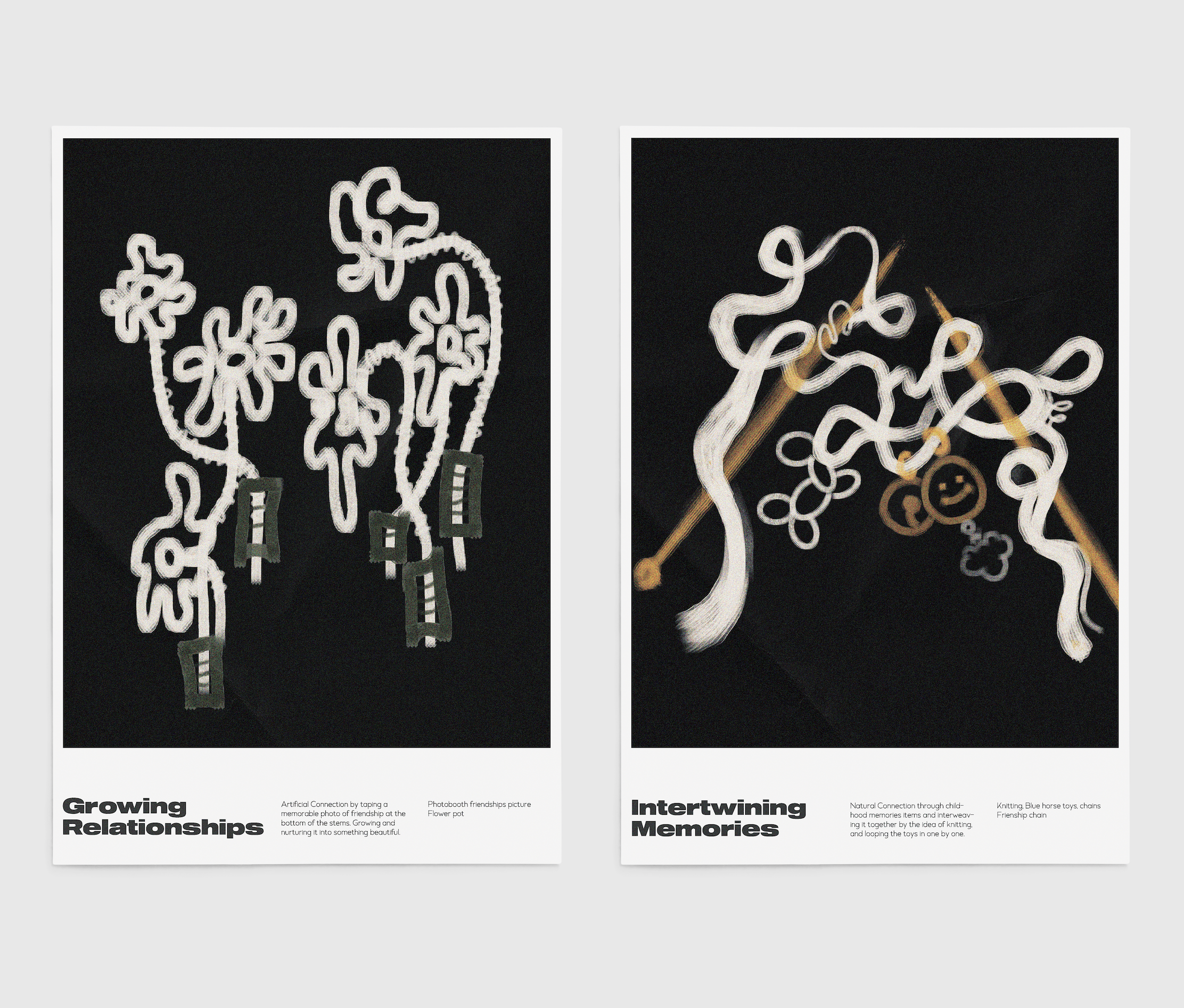 Natural poster ‘Intertwining Memories’ consists of a selection of objects that has deep connections to our past. As the piece of yarn intertwin together carrying along with the childhood and friendship chain everything will be knitted together smoothly. Combing objects to express who we are, how we grow up, and what we aspire to be. Artificial poster ‘ Growing Relationship’ also carries the same concept however the connection between the items is forced toward an idea such as growing our relationship with others. Placing a polaroid picture at the bottom and planting it until it blooms into some beautiful memories.
