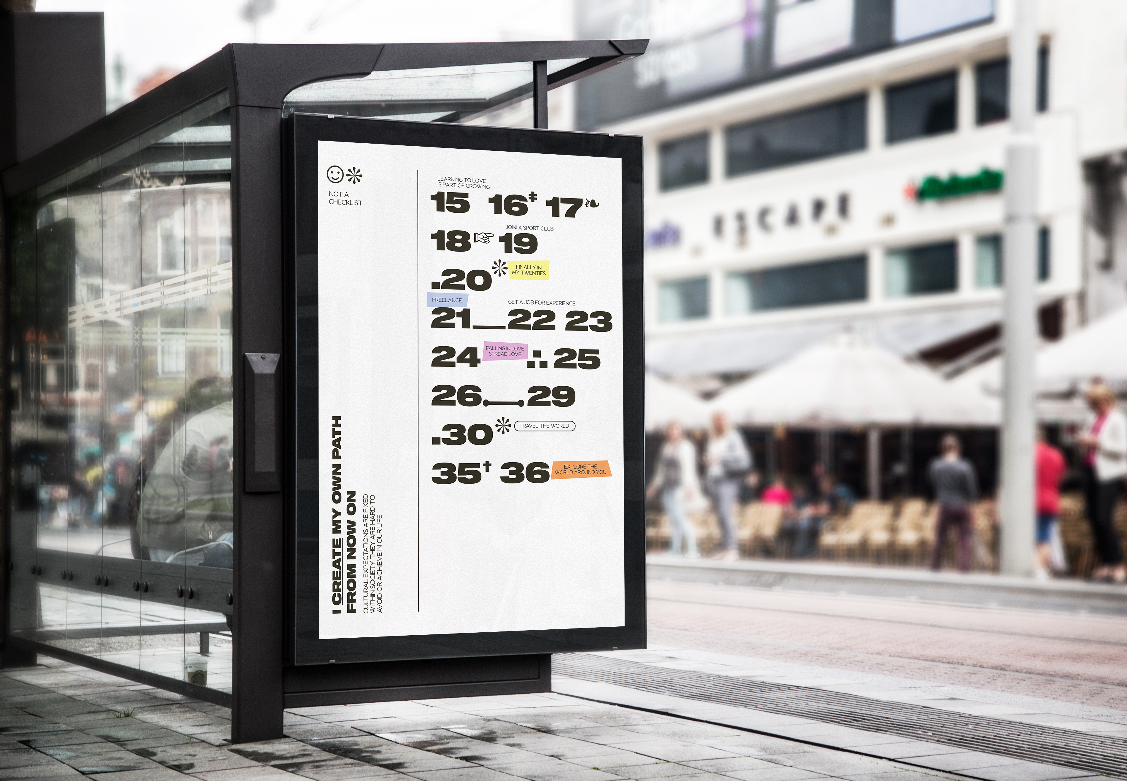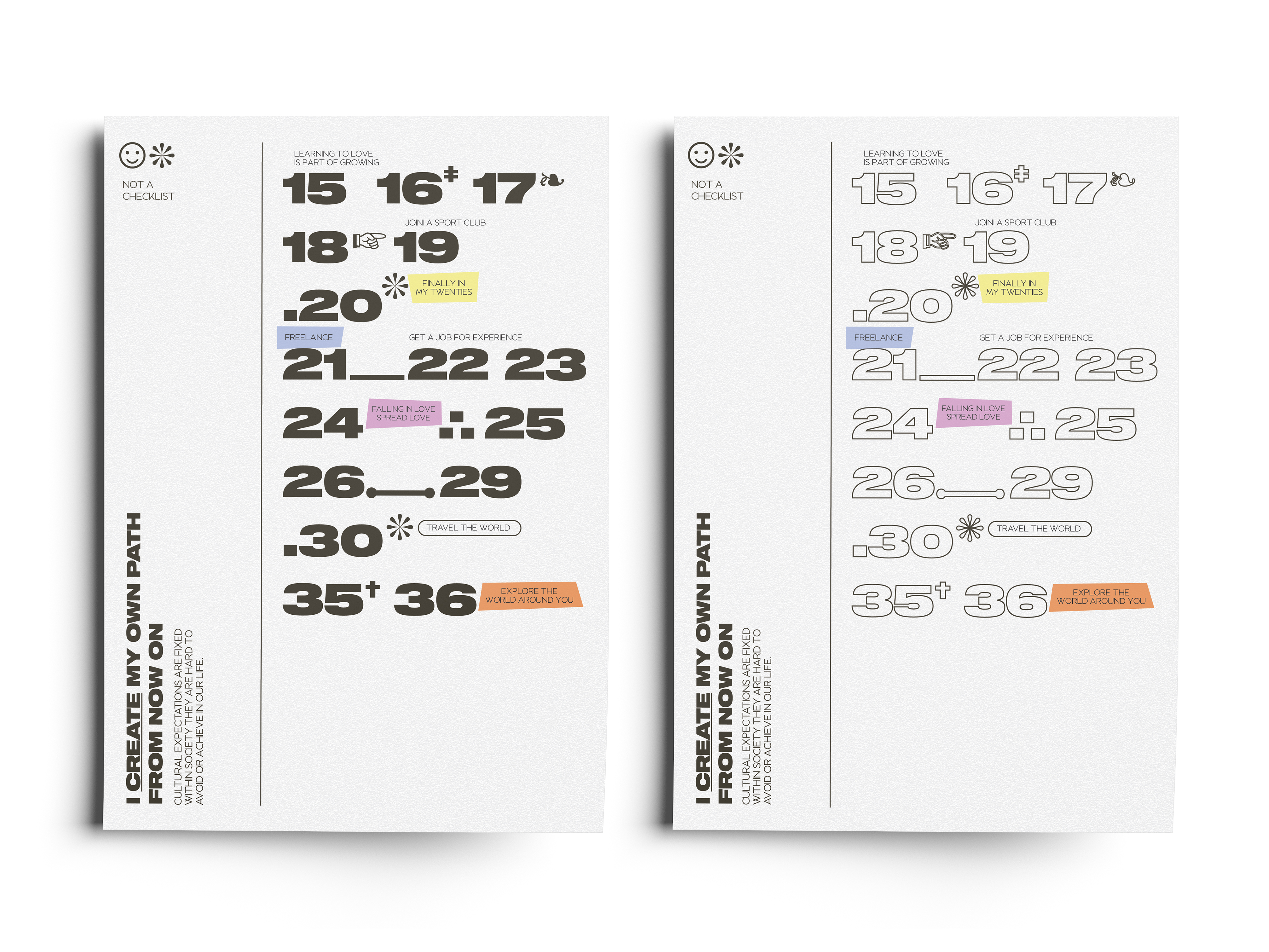 A timeline concept that portrays cultural expectations that are often expected of people to achieve in life. This poster demonstrates what people have to be reminded of consistently throughout various age groups.