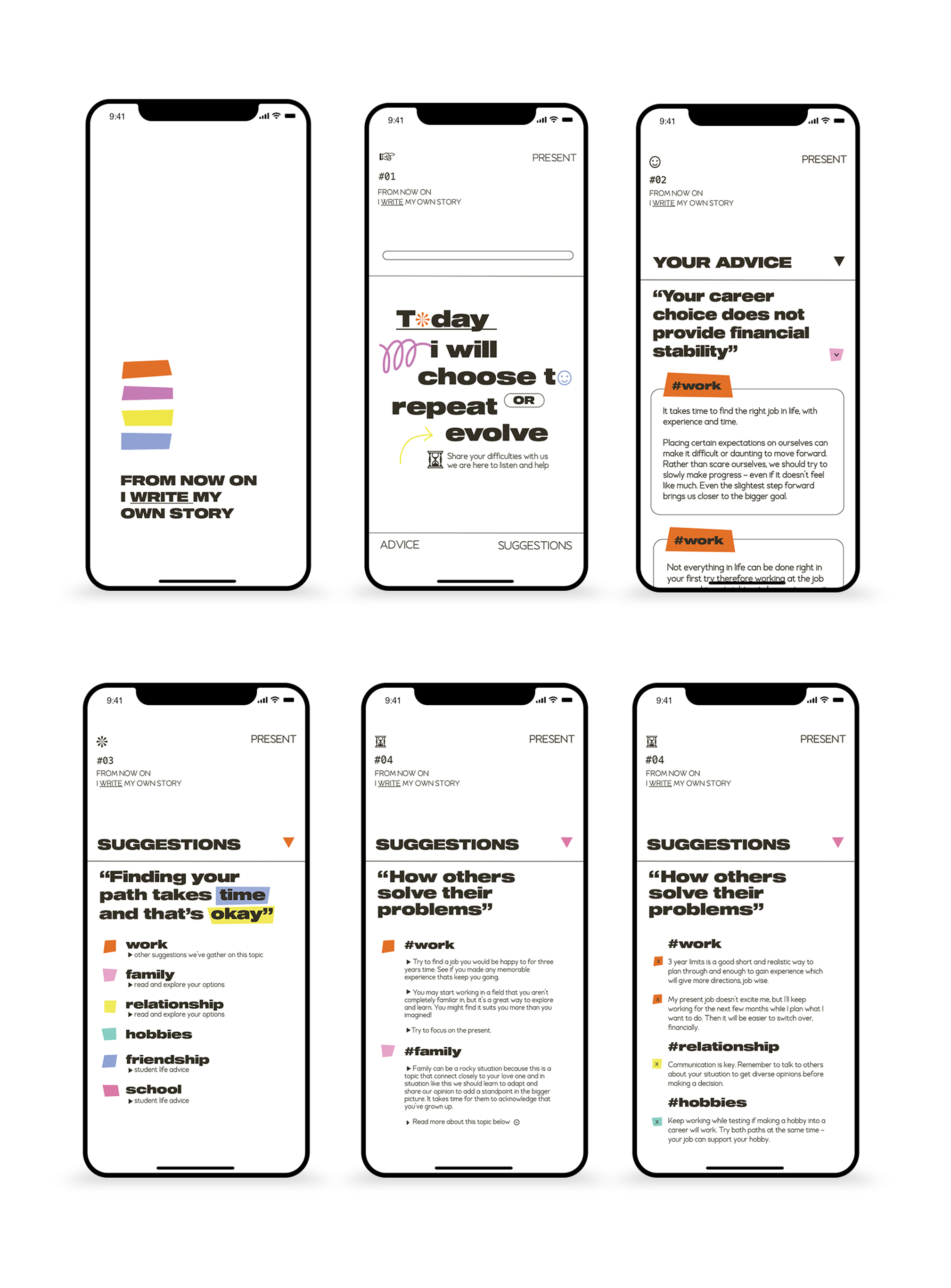 The reason for this is people often give better advice to others rather than for themselves. The section is ‘Suggestions’ this is where you can find other people’s previous advice on a certain topic. Each topic a divide by hashtags which will easier for criteria search. The last section would be ‘Changes I’ve Made’ can be recorded to see your progress.