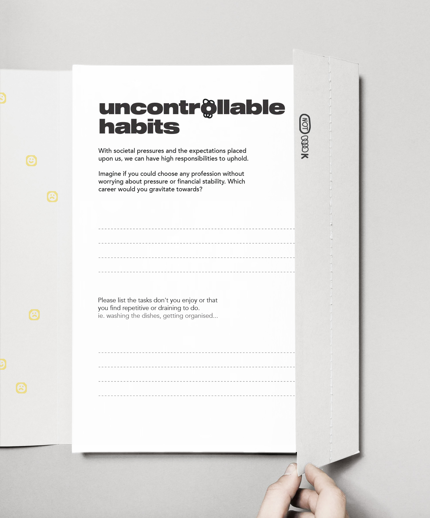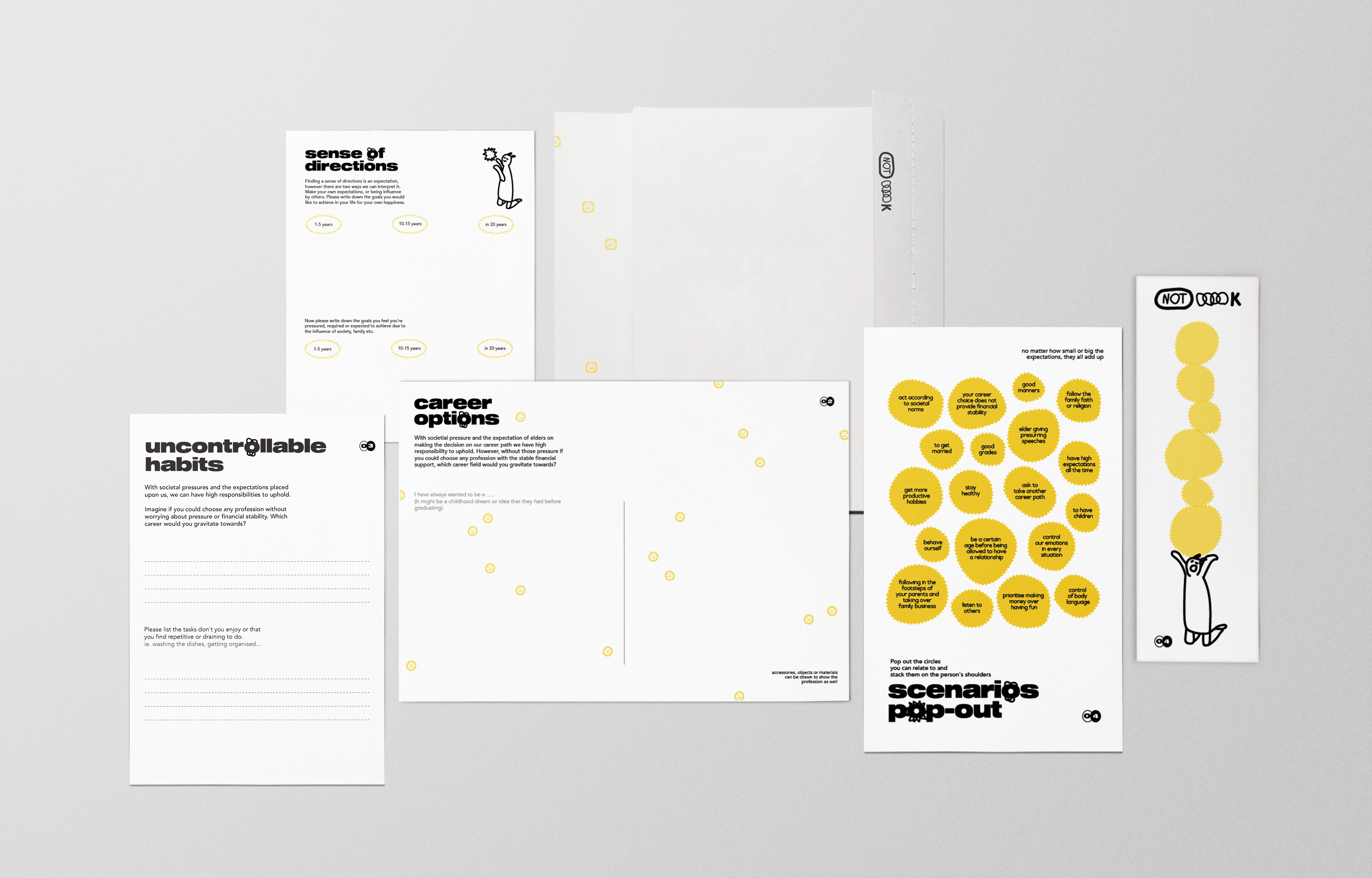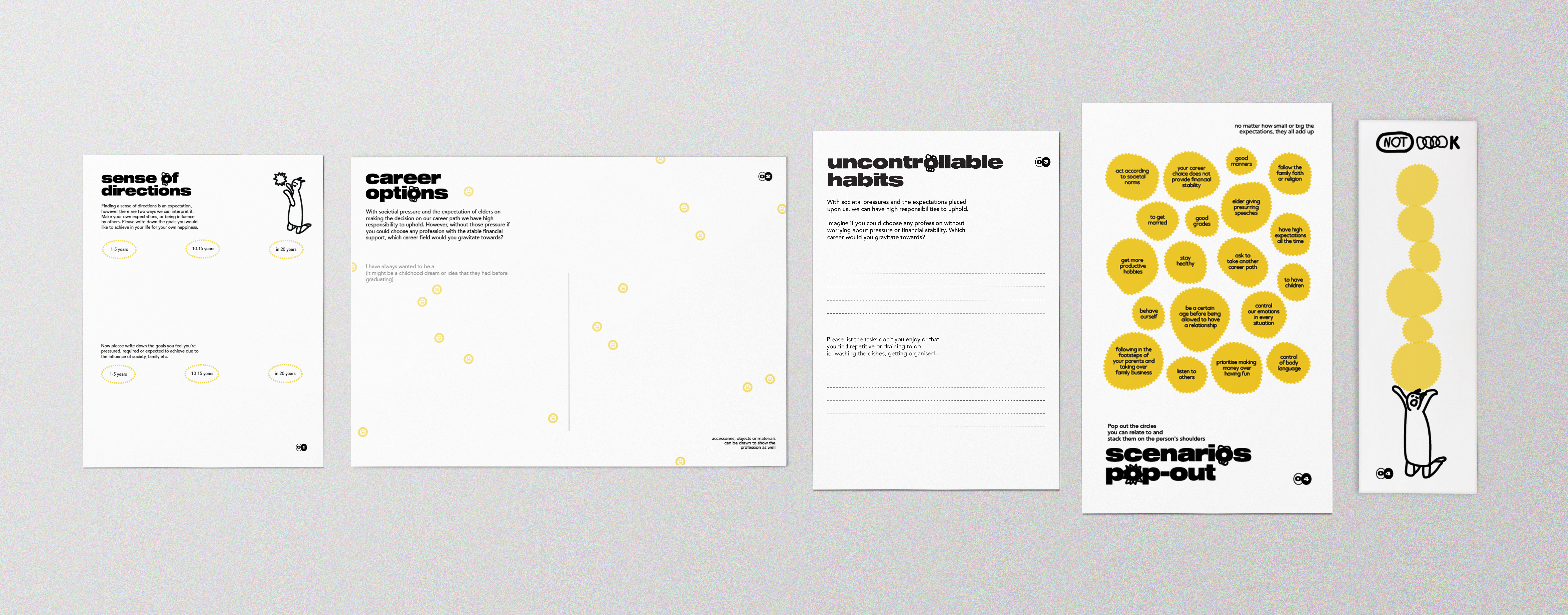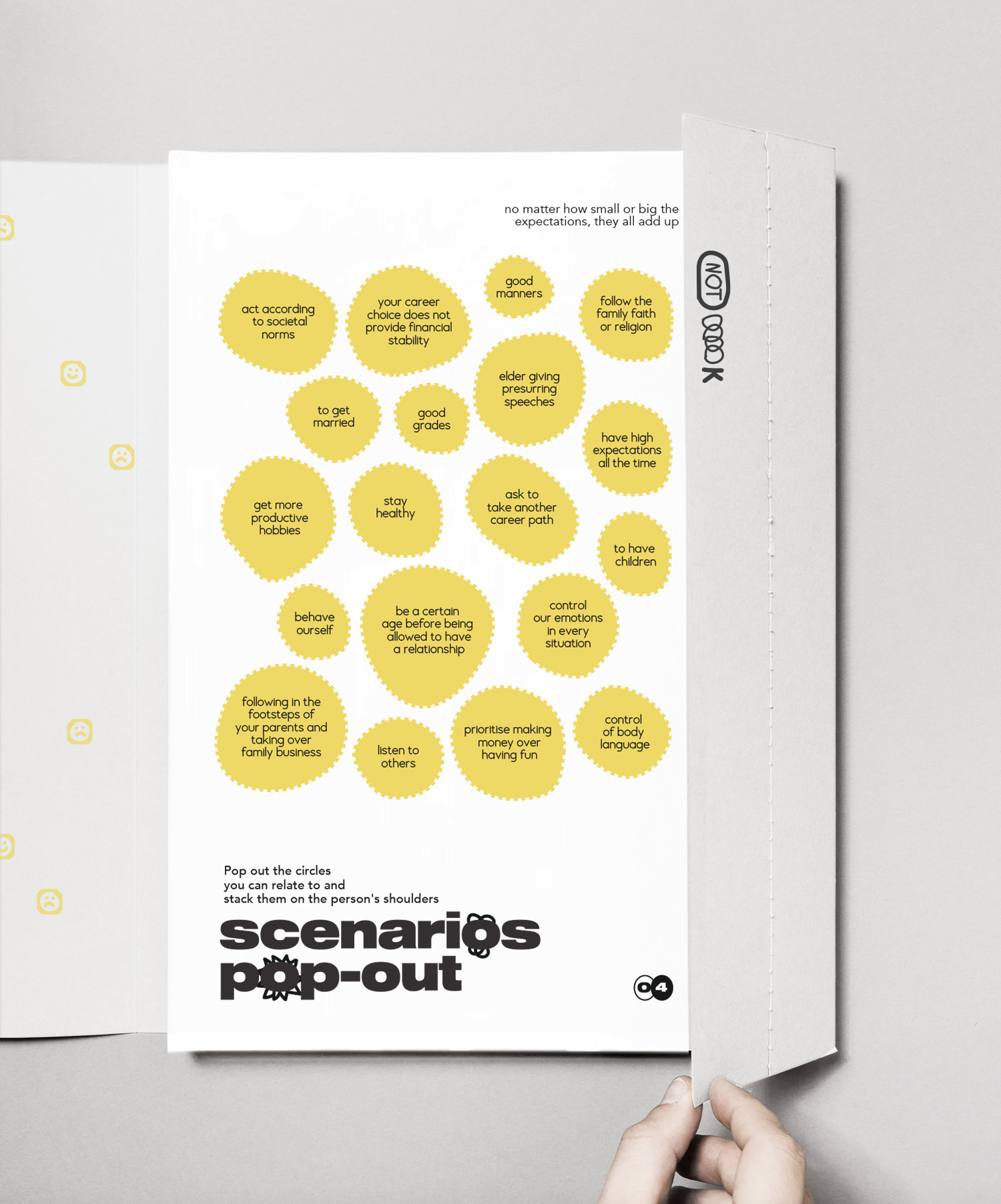 A design research kit about social expectation, that includes a questionnaire and activities to gather information on this topic. Overcoming social expectations can weigh a lot of pressure on your back. Pushing other people's perspectives and turning them into a responsibility priority that can take control over our social life. This kit would gently remind them not to take other opinions weighing on themselves so harshly. Acknowledging these expectations and take a step back and acknowledge your achievement.