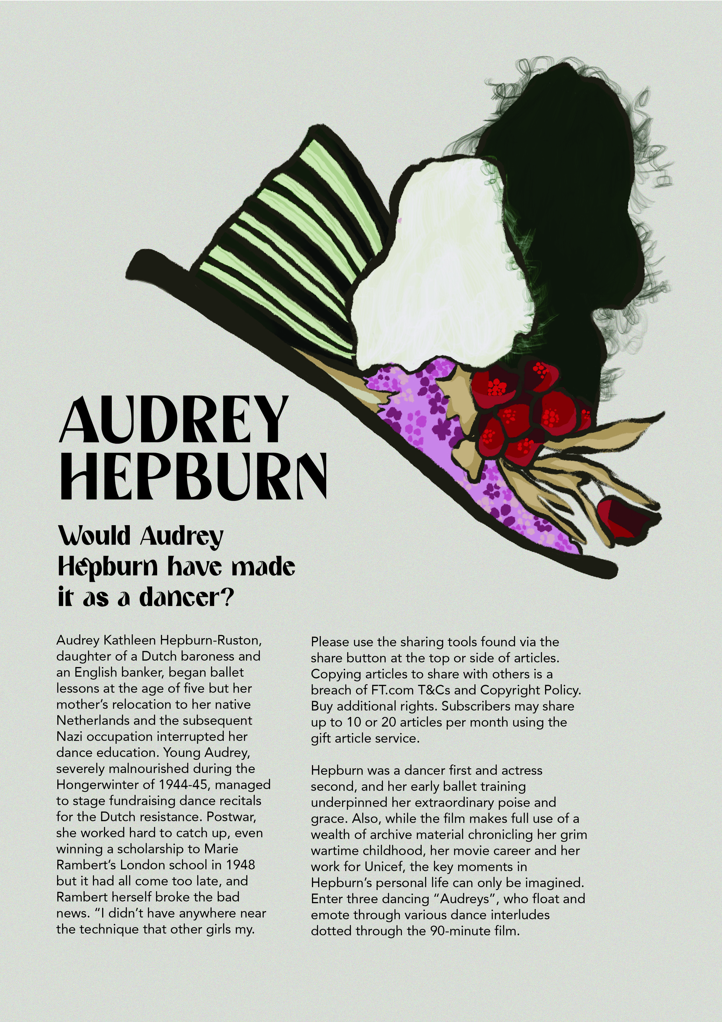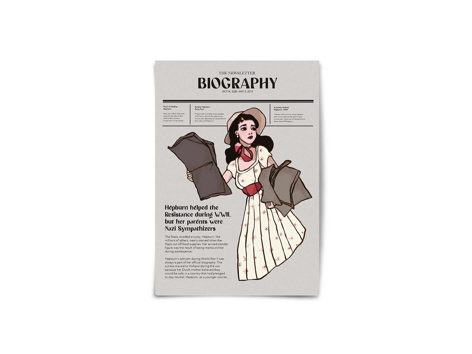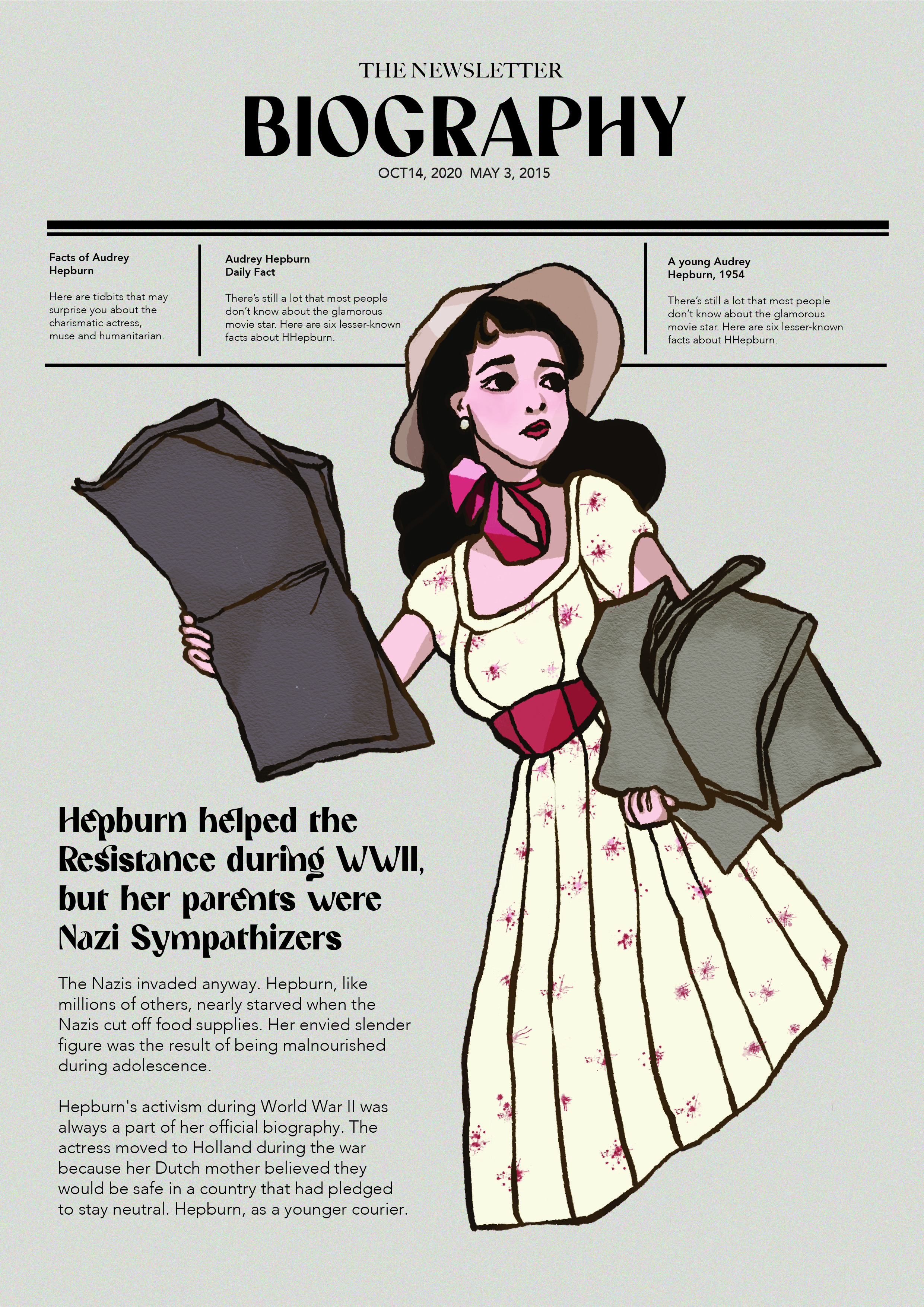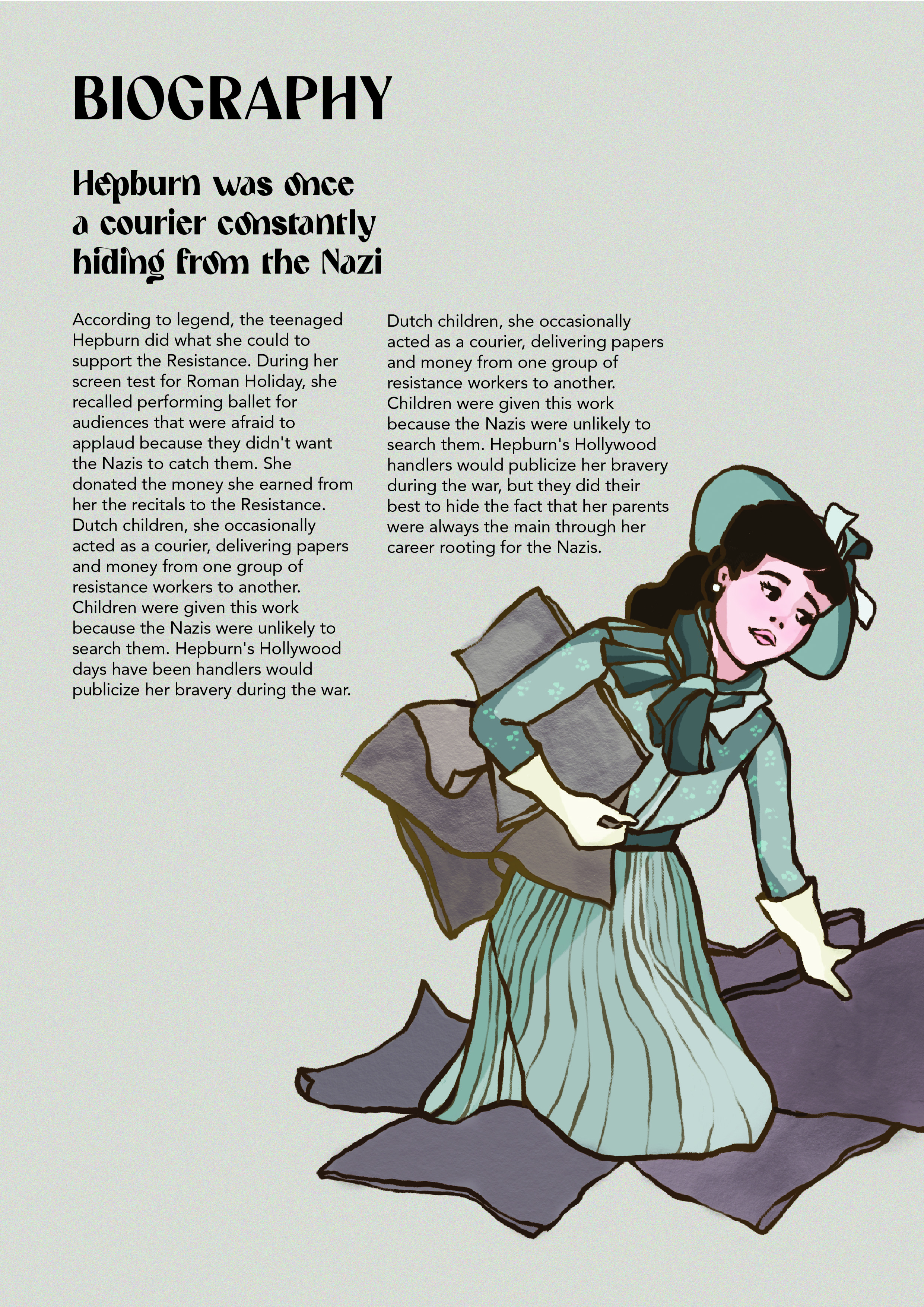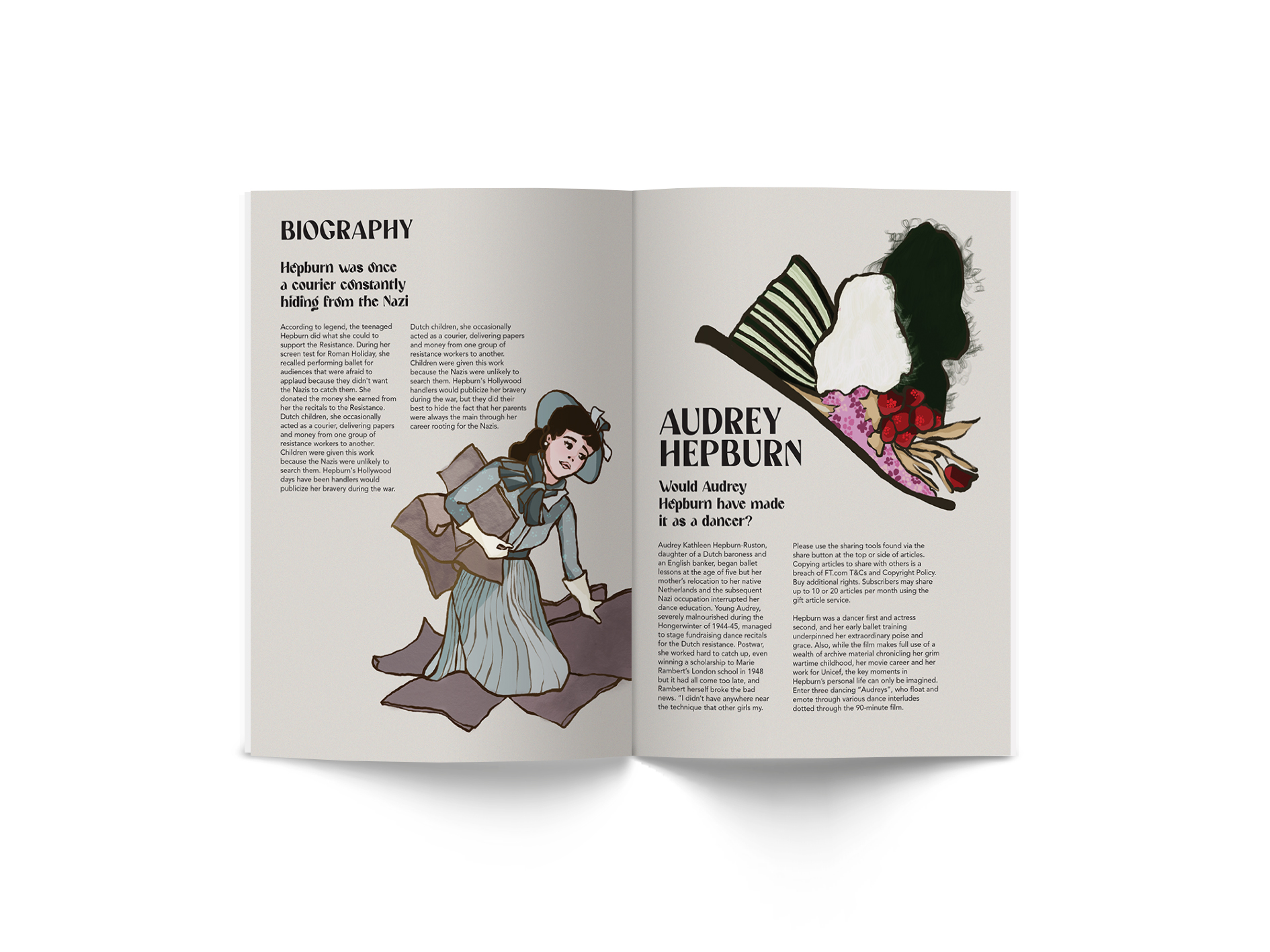 Audrey Hepurn is a well known actor with an astonishing achievements through her unique characteristic, who look up to. My illustrations captured Audrey ‘s younger self, experiences poverty and illness as a child. She had to discise herself as a ‘courier’ so she would not recognise by the Nazi, during WWII. My intention within the illustrations was to capture her recognisable fashion with a sad visual representations. The illustrations is spread amongst two main page of the magazine and a front cover.